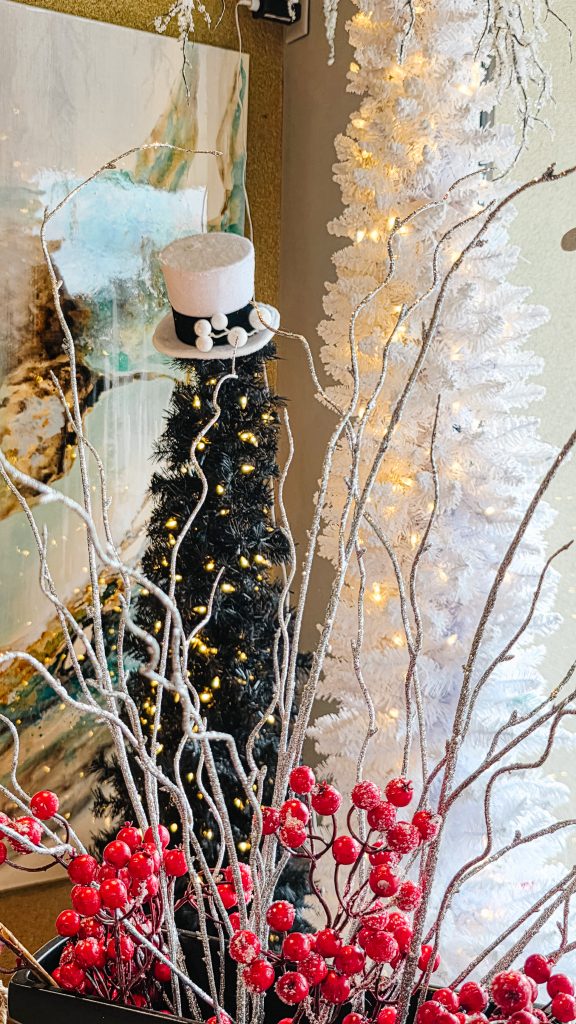 Whether you’re drawn to flocked evergreens dripping in sparkle, chic black-and-white statement trees with bold pops of red, nature-inspired designs filled with texture and warmth, or a whimsical white tree with vibrant jewel toned decorations and modern flair, each one tells its own festive story. We love these little birds dressed for the snow and the whimsy that the top hats bring.