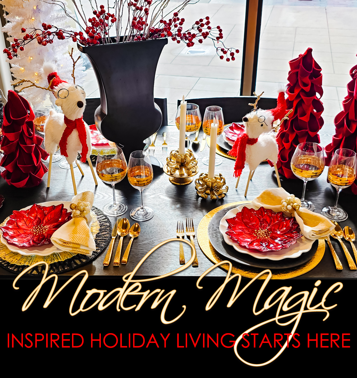 Whether you love the calm sophistication of natural tones with frosted greenery or the bold drama of red and gold, our tablescapes are designed to bring that perfect blend of elegance and warmth to your celebrations. It’s festive entertaining done the Modern Accents way – refined, inspired, and always a little unexpected.