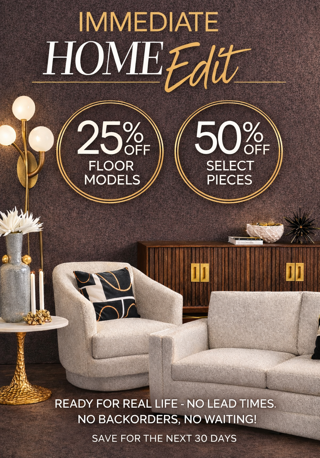 There’s something refreshing about finding the perfect piece and knowing it can come home with you right away. The Immediate Home Edit is our floor model furniture sale featuring beautifully styled pieces that are ready for real life—no lead times, no backorders, no waiting. Enjoy 25% off floor model furniture,